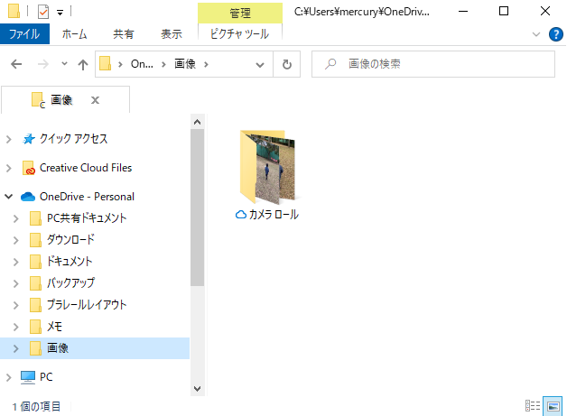 上の画像は、windowsPCのエクスプローラーの画面です。OneDrive – Personalという中に、フォルダがいくつかありますよね。今は、その中の画像フォルダを見ていますが、ここにスマホから同期された写真データが入っており、その写真のサムネイルがPCからは見られます。より大きな画像が必要なときは、該当の画像をPCの他のフォルダへドラッグ&ドロップするだけでオリジナルサイズのデータがダウンロードできるのです。